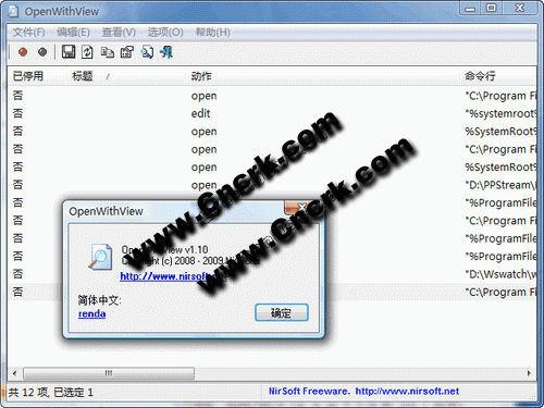 OpenWithView是一款用于显示在Windows操作系统的"打开方式"对话框里的所有可用应用程序列表的实用程序,它可以让您轻易地启用/禁用列表中的程序.当程序被禁用后,它将不会在"打开方式"对话框的"其它程序"位置显示.该实用程序在当您的"打开方式"显示了太多的程序并且您想要移除您不经常的使用的程序很有用.此实用程序能在Windows XP,Windows 2003 Server和Vista下工作是否觉得右键菜单中的"打开方式"的程序列表太多了?可以用这个整理一下