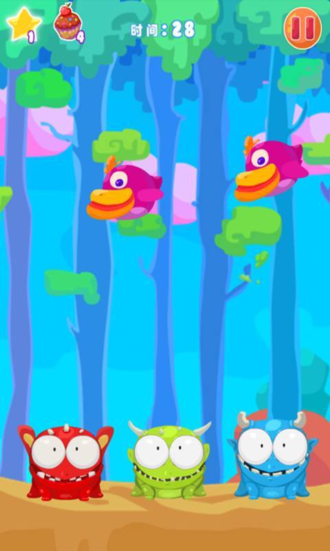 地上的三只小怪兽渴望着天上能够掉下来甜食吃。可是,有时候小鸟会便便下来,这时候小怪兽如果不闭嘴的话就只能尝到苦头了。游戏中,玩家点击飞过的小鸟就会变成蛋糕掉下来。如果没有点击掉小鸟会便便,这时候你要点击小怪兽的嘴巴,避免吃到便便。