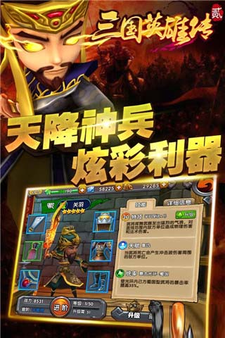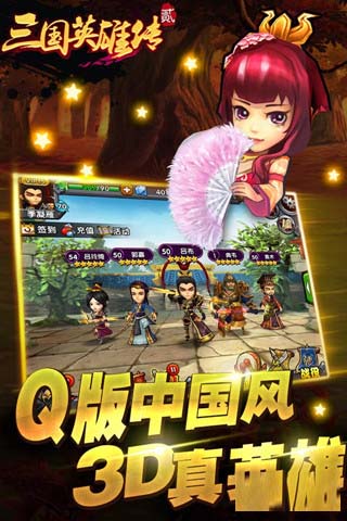 《三国英雄传2》是一款好玩永不过时的3D真英雄动作类卡牌手机网游,游戏是以三国为背景的,游戏中的人物设计的都是非常Q版卡通的,你可以和游戏中的角色进行擂台夺旗!