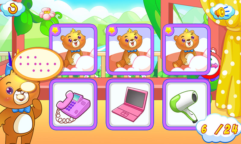 2、整理家电:宝宝需要观察场景中缺少的家电,然后通过左右滑动下方的家电列表,找到画面中缺少的家电。