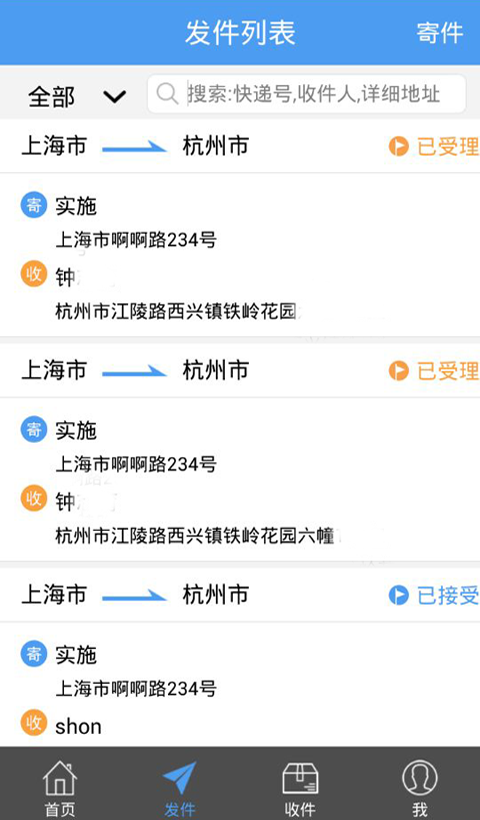 *寄件:自动保存寄件人和收件人信息(姓名、手机号、地址),常用地址寄件、一键发件。*查件:免输入便捷查询,可通过快递号查件,也可扫码查件。