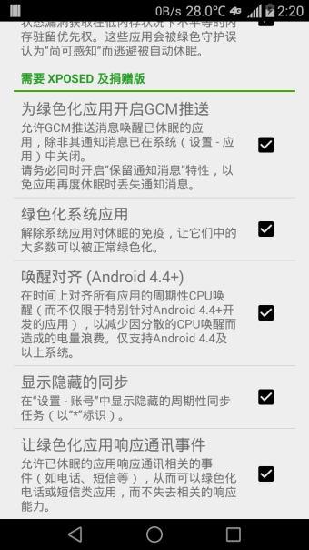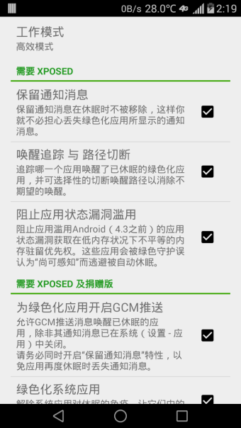 * 推送消息。应用的实时消息推送也将失效,因为Android下的推送消息将会在后台激活应用,而不是像iOS那样只显示消息给用户。(注:捐赠版中的一项试验性特性可让GCM推送唤醒绿色化的应用)