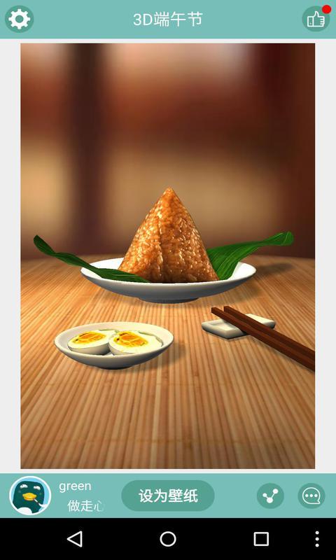 3D端午节-梦象动态壁纸是一款精美端午粽子美食3D动态壁纸,竹子质地的桌面上摆放着一个白色的盘子,里面装着美味的糯米粽子,在嫩绿色的粽叶衬托下,糯米粽子看起来十分诱人,旁边白色小瓷碗里面还有两瓣咸鸭蛋,也是端午节必备的特色美食哦,两份干净的筷子和瓷器碟子已经准备好了,就等你来开吃辣,下载3D端午节粽子美食3D梦象动态壁纸,马上加入我们的端午节粽子美食阵营