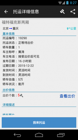 查看轿车托运详细信息。