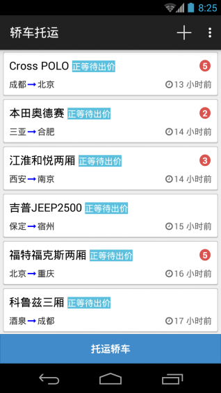 使用本应用发布轿车托运需要,等待轿车托运公司报价。