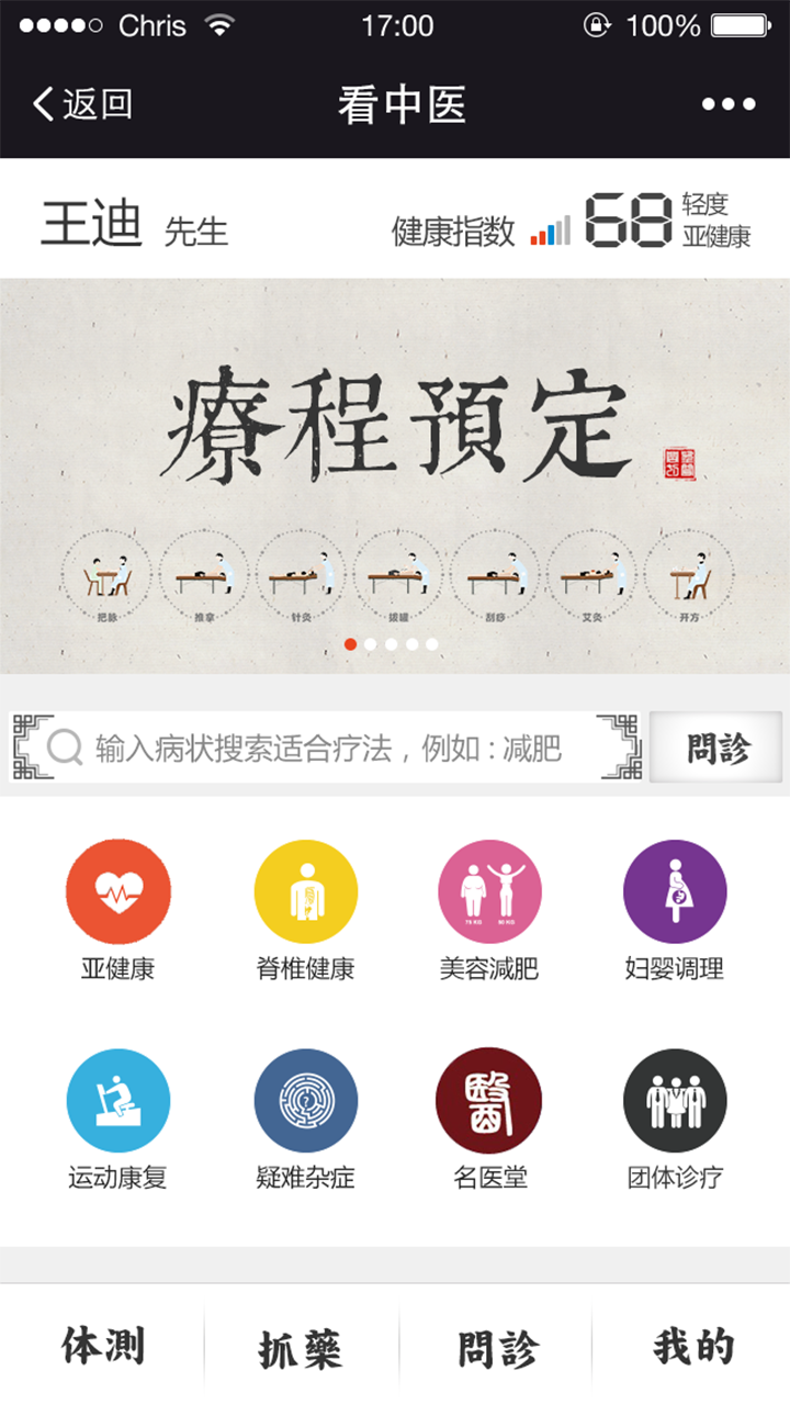看中医是国内第一家中医出诊的产品,通过挂号(用户预约)、诊疗(望闻问切)、医嘱(后续体质跟踪)等方面对用户进行出诊服务。