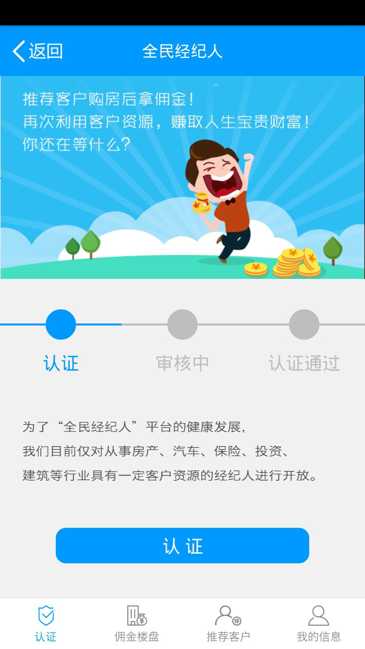 3、添加“全民经纪人”功能,可注册成为经纪人,查看“佣金楼盘”,推荐意向客户,推荐成功并通过我方审核可赚取相应佣金;