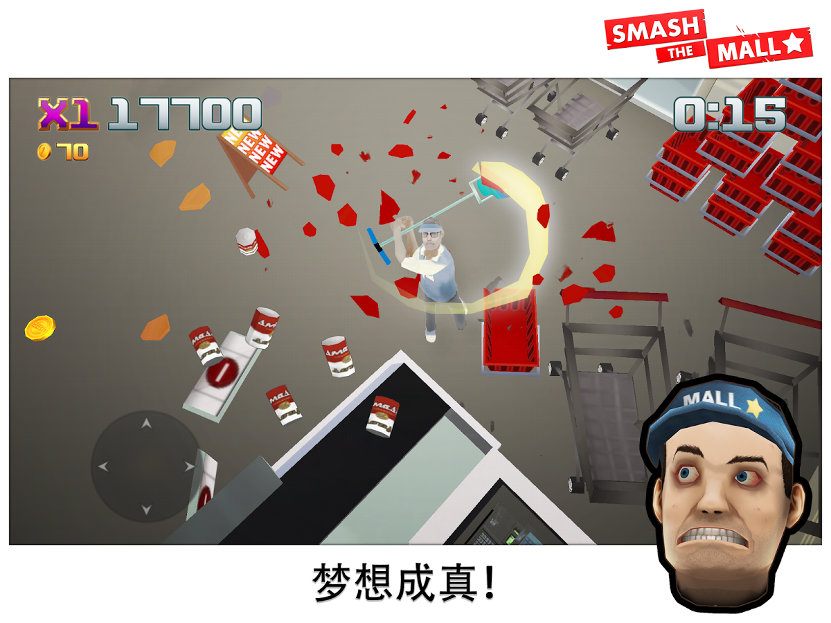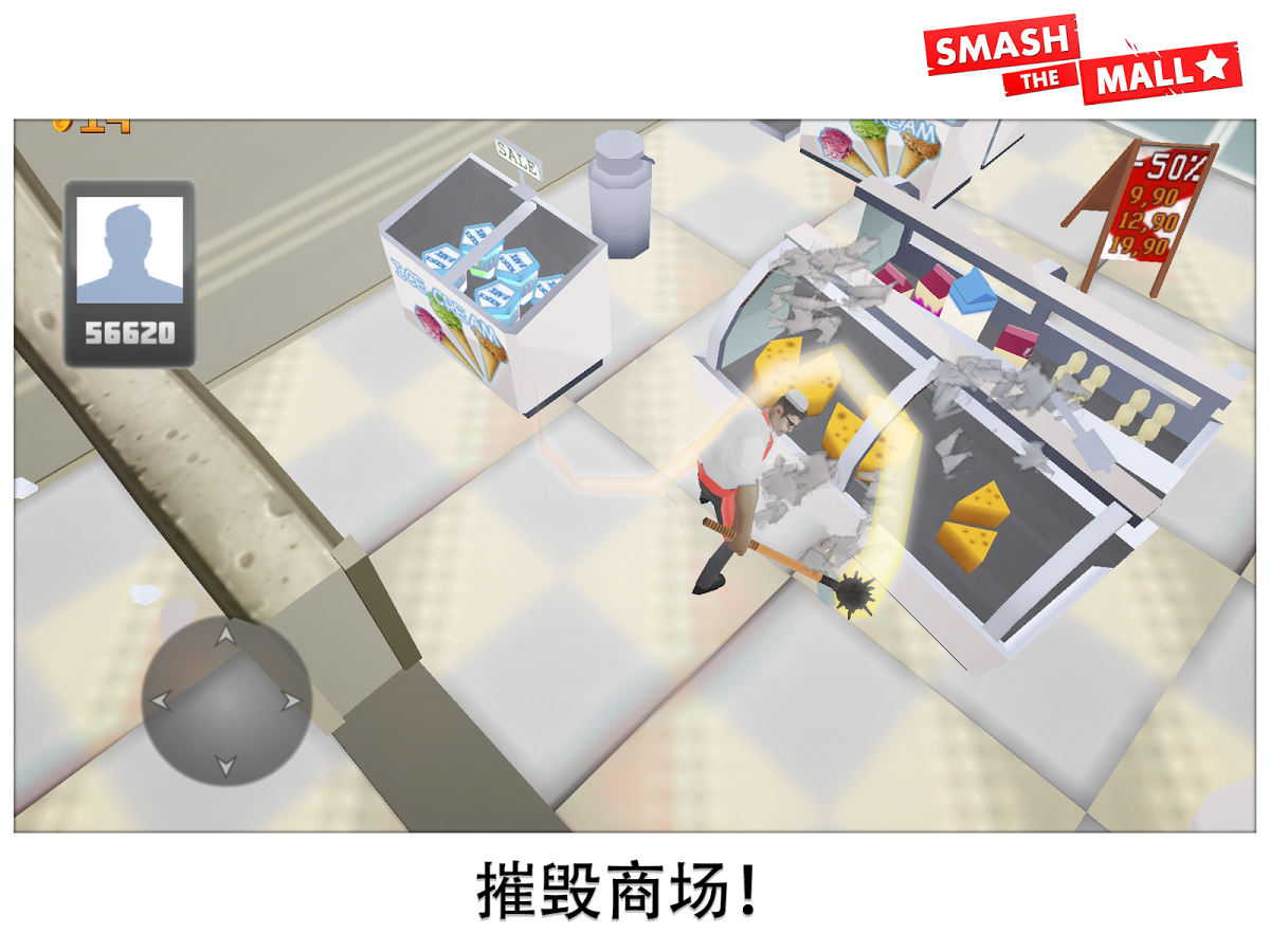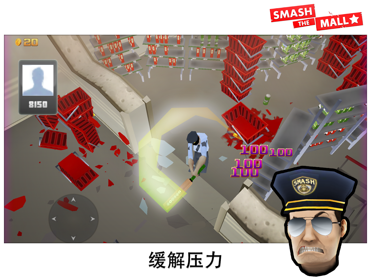 《粉碎商场 Smash the Mall》是一款有趣的发泄游戏。你还在忍受商场老板的责备吗?还积攒了一肚子怒气没地方宣泄吗?你是不是看冰冷的商场很不顺眼?这款游戏可以帮你解决你的问题,带上极具破坏力的武器,任意摧毁商场的任何地方。随着游戏的不断深入,你还可以解锁更多的破坏武器和角色,并且可对武器、房间和服装等进行升级哟~现在就来尽情地缓解你的压力与烦恼吧!【使用方法】