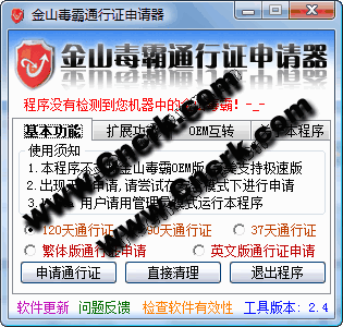 功能: 1.支持2008、2009版金山毒霸正式版 官方主页下载的,完美支持极速版 2.智能识别金山毒霸安装目录 3.智能识别安装的金山毒霸版本,非手动更改 4.能够申请120天、90天和37天试用