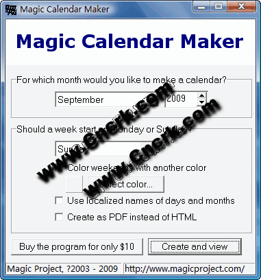 Magic Calendar Maker V3.10 英文绿色特别版 一款容易上手的日历生成及打印程序,你需要做的只是选择年份和月份而已。剩下的全部由 程序自动完成! 最後的结果将会以HTML方式输出,你可以从浏览器里面把它打印出来。 同时,每个栏中都有足够的空间让你写下简短的约会和笔记哦