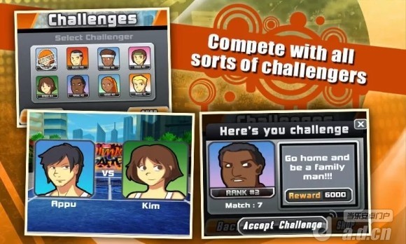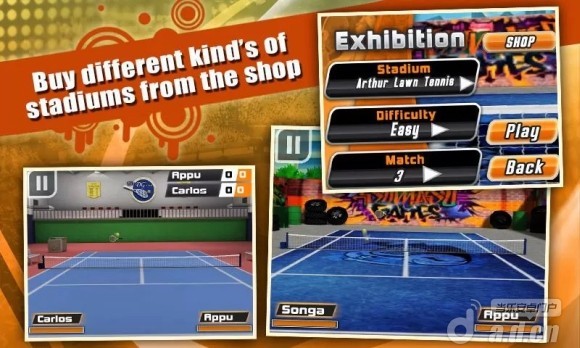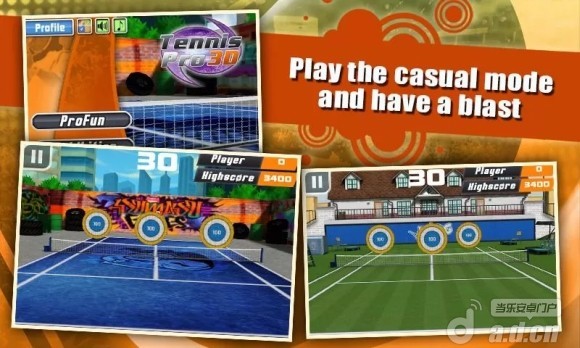 《3D网球 Tennis Pro 3D》是一款主打街头风格的网球游戏,游戏采用了卡通画风,鲜艳的配色和街头涂鸦说明了开发商以年轻人为主要目标玩家。游戏采用了第一人称 3D 视角,不过对面的运动员以空气球拍代替。游戏提供了3种模式、8名角色和多个网球赛场,你可以在不同的场景下过一把网球运动员的瘾。开发商宣称电脑 AI 的技术很高,它们会给你带来不小的挑战。