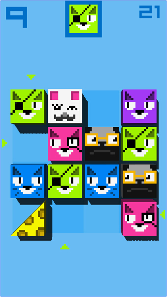 乍看上去,本作有点像《2048》,但玩起来其实完全不一样,只是同样以 4*4 的方格作为界面而已。在 4*4 的表格内,有各种各样的像素风老鼠头像方块,此外还会有一块三角形的黄色奶酪,玩家要做的就是在有限的步数内划动屏幕,让相同两个的老鼠方块互相消除,把空间清理开,让白色的老鼠能够毫无障碍地吃到奶酪。不像《2048》中划动屏幕会让数字完全靠到表格的边缘,本作中划动屏幕只会让方块移动一格。而且需要注意的是,白色老鼠和奶酪的方块是不会随着玩家划动屏幕而移动的,所以一定要预计好划动后方块的位置变化。当白色老鼠方块与奶酪方块之间的障碍完全消除,白色老鼠方块就会自动移动到奶酪方块将其吃掉,并在某个随机空方块生成一个新的奶酪,同时为玩家增加一定的移动步数。