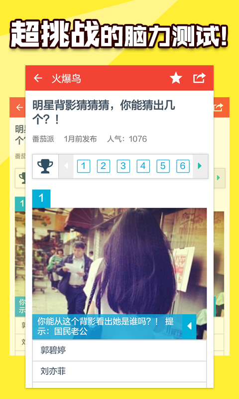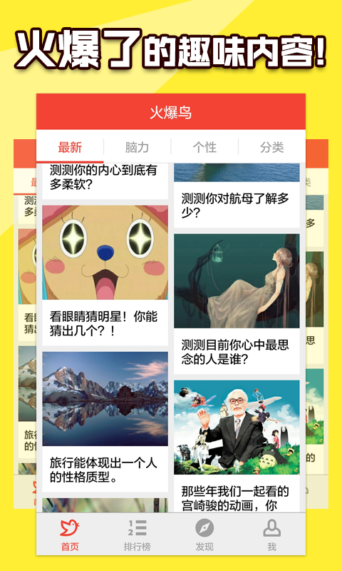 火爆鸟app 是一款非常有意思的趣味应用。这里有超好玩的个性测试、超具有挑战的脑力测试,以及超热火的内容排名,让你的生活因火爆鸟app而精彩 !