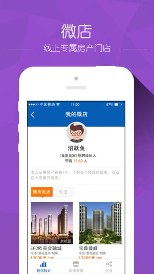 2.微店增加店铺管理和数据统计功能,支持设置需要显示在微店中的楼盘、以及楼盘的排序;同时,支持查看微店的转发次数