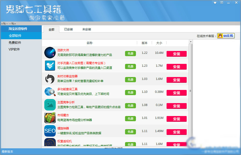 鬼脚七工具箱是一款专门针对淘宝店长和运营必备的免费工具软件,内含8款淘宝实用的工具软件,软件免费使用,功能强大,是卖家必备的一款工具!