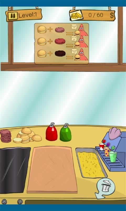 《海绵宝宝当大厨》海绵宝宝得到了一份新工作——制作和售卖汉堡,他需要及时的根据客人的需要做出相应的汉堡,不然就会因招待不周而被辞退!来帮帮海绵宝宝吧~我知道你能做的很好!游戏玩法:点击屏幕制作和售卖汉堡。