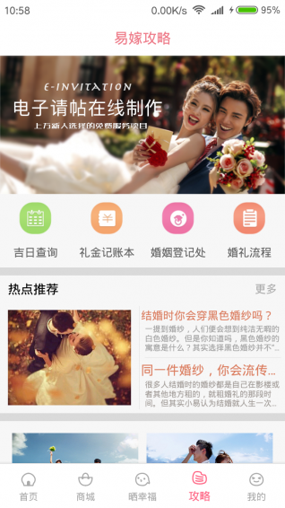 幸福易嫁是一款便捷的掌上购物应用。该应用是专为各大即将步入婚姻殿堂的新人们所准备的购物平台,婚礼中的一切物品皆可在幸福易嫁APP平台上购买,用最优的性价比购入。