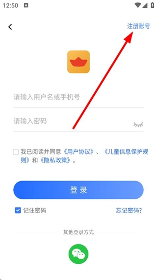 3、于登录界面,点击右上角的“注册账号”选项,即可进入账号注册页面。