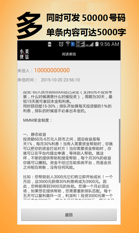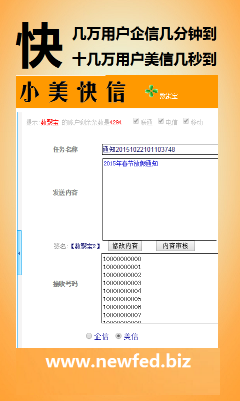 小美快信APP提供手机短信群发、企事业单位群发信息和收发美信。美信是小美自主研发的新一代信息收发产品,可以支持一次性向500个用户发送字数达5000字的信息,美信免费收发,企信每条8分钱。小美快信平台是互联网上的平台,可以对上万用户发送短信和美信。小美快信适合各类企事业单位发生生产信息、会议通知信息,如快递员发送到件通知等。倡导信息文明,拒绝垃圾短信。