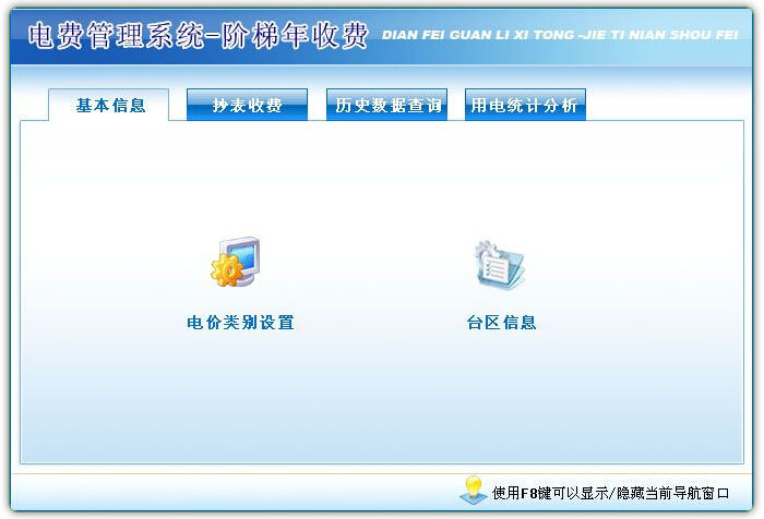 1、基本信息(基本信息和电表查询(按台区查询、按用户查询));2、抄表收费管理(设置年月、抄表导入、抄表录入、收费录入、未交费用户查询、期间收票员合计、台区电费累计、期间收费统计);