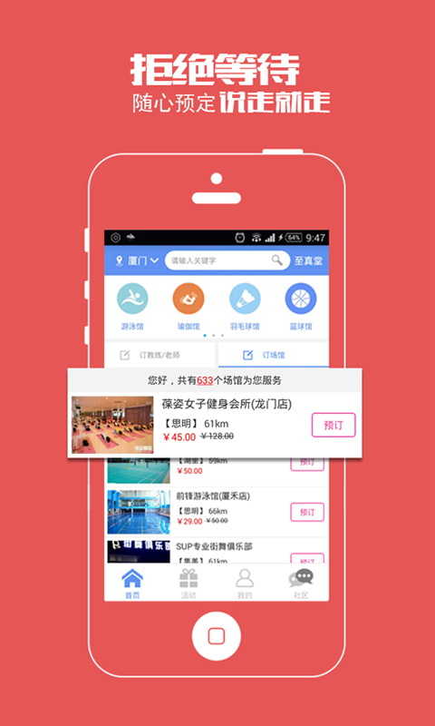 1.厦门最大的运动社交平台2.结合互联网+、开启运动新模式,解决挑场馆,选场地,找教练等问题