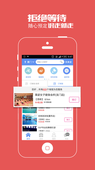 找场馆:27种运动项目,海量的场馆展示,实时增加的场馆让您有更多的选择。选运动,找场馆,定场地,您的需求我们帮您搞定。