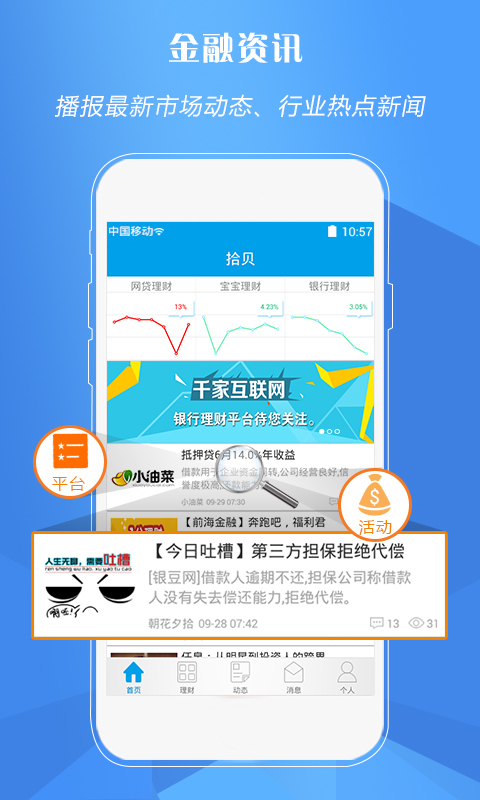 拾贝-手机互联网理财比价神器汇聚全网活期、定存、宝宝、银行理财产品,一站式比价理财工具。强大的理财资讯库,每天更新市场动态、行业热点新闻,完美的互动分享功能,人人参与其中,SNS社区看金融大咖观点,参与平台活动,等你辛辣吐槽。拾贝专注互联网理财“让电子钱包里的数字更快更合理的膨胀”。【软件特点】