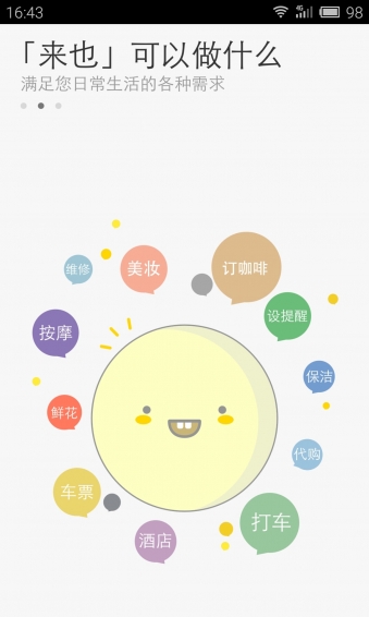 贴心的真人助理来也app!您可以吩咐小来约用车,订咖啡,送快递,跑腿代办,订机票车票酒店,约上门保洁,推拿,维修等等,还能设置各种提醒哦~琐事烦事让来也帮您,把时间还给生活^_^【软件特点】