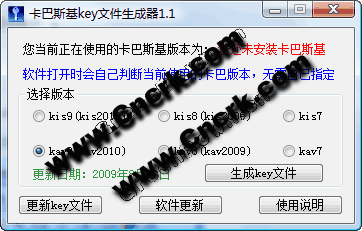 卡巴斯基KEY文件生成器 V1.2 简体中文绿色免费版 卡巴斯基key文件生成器能快速生成卡巴斯基7.0、卡巴斯基2009(8.0)、卡巴斯基2010(9.0)的授权key文件,支持kav和kis两个产品系列,软件本身自带最新的授权文件可以过卡巴黑名单,下个版本还将实现网络实时更新key文件的功能,让你可以在第一时间找到可用的授权文件。本程序无毒、不改主页,欢迎广大卡巴爱好者下载使用。