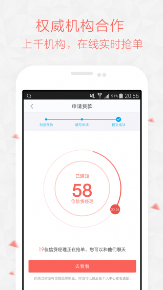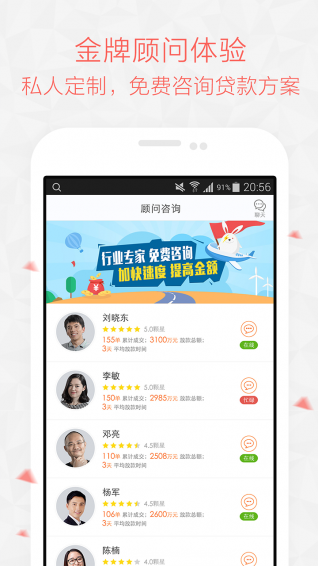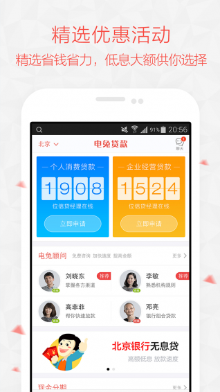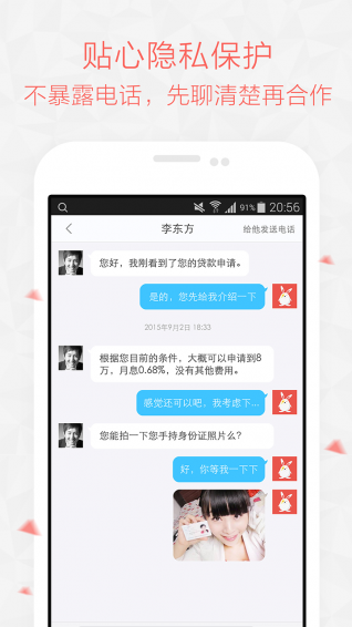 如果你需要贷款,您可以在平台上发布申请单,您的申请单会立即推送给匹配的信贷经理。收到推送的信贷经理会立即参与抢单。这时您可以和信贷经理在线聊天,如果达成意向,再给对方发送电话号码,这样可以避免电话被公开,受到骚扰。另外,如果您只是想先了解一下贷款的一些事情,也可以在APP里免费和电兔贷款官方的顾问聊天,他们会帮你解决疑惑,也可以为你提供贷款方案。