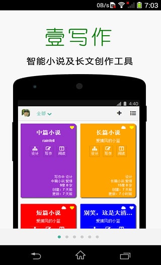 壹写作提供了多种可一键生成的长中短篇小说模板,引入了可扩展的主题引擎,引入了随时预览生成的写作模块及仿真阅读体验。