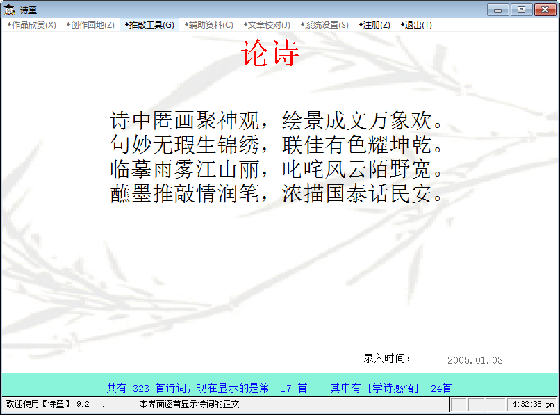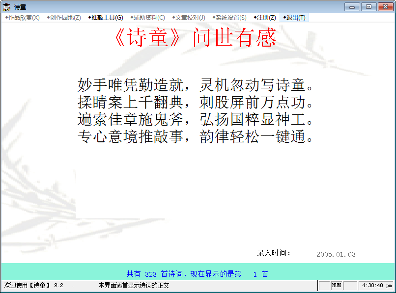 诗童是一款诗词管理软件,特别适合诗词爱好者管理自己的诗词作品、在[诗童]的协助下创作新作品、也可搜集整理自己喜爱的诗词作品。具有诗词作品管理、格律检验、字词句多能宝典、制作电子诗集等功能。可以方便的打印输出或复制到你正在编辑的其他文本中。下载后即可欣赏到软件作者的诗词作品,可以试用格律检验、字词句宝典。如果感觉好用,交费注册后就成为你自己诗词的好管家。【软件特点】