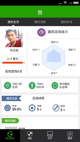 个人足球战力值(没错就是实况里的那种帅呆了的六边形图),足球技能相互认证,足球比赛数据全纪录。让你的足球青春永远留存。让我们见证一个草根足球明星的诞生,甚至是业余足球圈的大师级偶像,我可没有开玩笑。