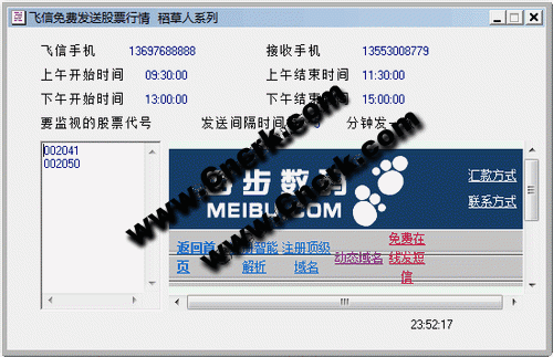 稻草人股票行情免费短信系统利用飞信系统,免费发送股票行情,发送频率和股票品种有自己任意定义,不会产生任何费用,发送和接收都是免费的。可以对股票的现价、涨幅、最高价、最低价、开盘价。一目了然