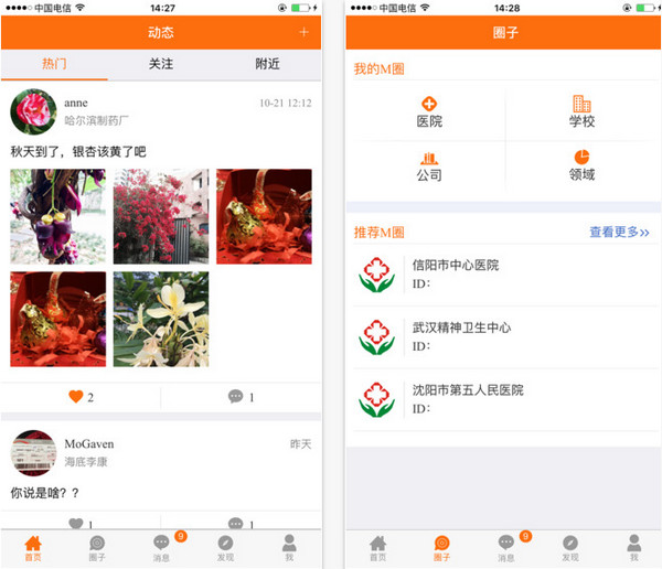 圈子功能--分为医院圈子,学校圈子,公司圈子和领域,让您更高效的工作,更有利的拓展人脉关系。