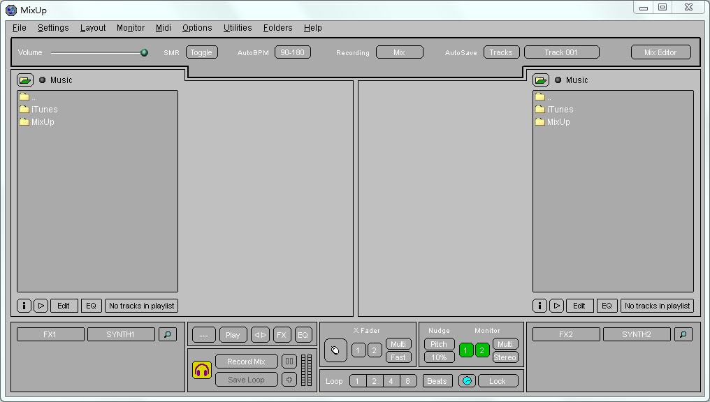 混音器(MixUpDJ) 2.08 免费版 MixUpDJ是一款非常专业的混音器,这款软件由Spacehead Systems制作出品,能够帮助用户简单的进行声音结合,加强歌曲的律动感和节奏感,将家庭音乐改造达到歌舞厅那种效果,带用户体验全新的音乐律动。