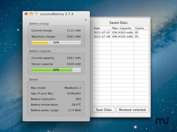 coconutBattery的图标就是一个有闪电符号的椰子,也就是名称中coconu的意思。coconutBattery的应用非常简单,可以独立运行查看电池信息,程序打开后没有任何后台,也不会常驻在菜单栏种。主界面下我们可以查看到MacBook的型号,生产时间,代号目前的电池容量等。此外,还可以看到电池的生产时间,循环周期、电池状态、电池温度,是否正在充电等信息。coconutBattery的主界面包括信息和历史两个功能。在信息界面还可以查看Mac和电池的详细信息。