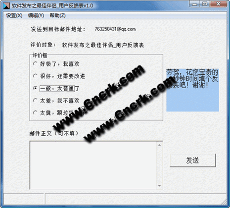 软件发布之最佳伴侣用户反馈表 V1.0 简体中文绿色免费版 当你发布软件;商品;网站之后,是否想得到用户的评价反馈以及改进意见,本软件能让用户在一秒钟之间填完一张反馈表,举手之劳,用户何乐而不为,大大地增加了您的反馈率,帮你准确地掌握用户喜好,尤其是 共享收费软件更需如此,本软件是免费软件,有delphi7源代码,无版权,随您任意改动利用发布,你想怎样就怎样