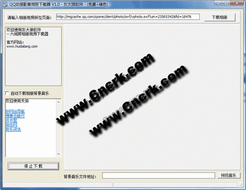 灰大狼QQ动感影集相册下载器 是一个专门用来下载QQ动感影集的工具。只需输入QQ动感影集地址,即可自动解析出相册视频中包含的图片和音乐,可以预览或者下载保存到本地。QQ动感影集的地址,可以在影集点复制地址得到