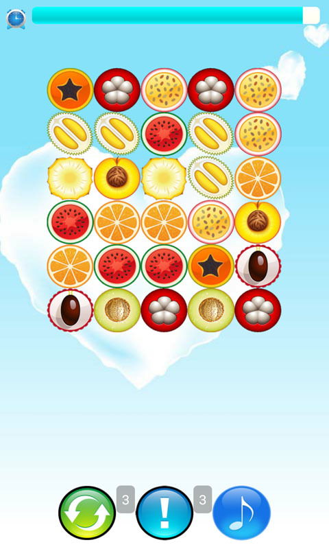 一、点击两个相同的水果,如果正确会有一根线连上;二、第一关的时候,时间很充足,很适合慢慢的玩;