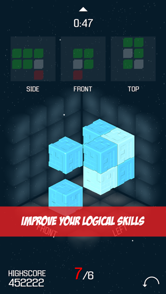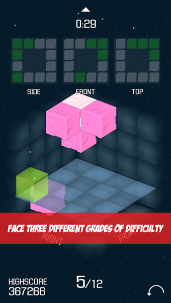 《遗失的方块LostQubixleFree》是一款立体感十足的方块解谜类游戏,游戏中的画面非常的炫酷,玩法也是超级的有技巧性。游戏中你的任务是从三个角度观察并重建模型。这个游戏需要你的观察技巧并考验了你的逻辑思维。在这个游戏中克服你的三维障碍并提升你的逻辑思考能力。游戏稍有难度,不过如果对立体三视图比较敏感的话,玩起来应该会很顺手。