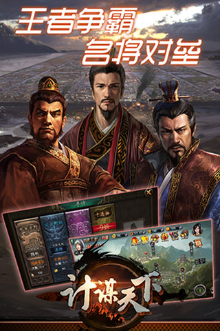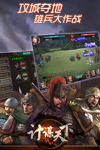 《计谋天下》是一款集战争策略,角色扮演为一体的三国题材手游。游戏中玩家可以选择扮演弓箭兵,步兵,骑兵的主公,通过处理日常事务实施招募武将并训练,研究技能,收取税收等指令增强实力,带领武将与部队出征,战斗,寻访武将,搜集材料,打造装备,最终一统天下!霸气写实风格,真男人的游戏,全新即时自动战斗系统,千变万化的战场格局!丰富的兵种组合,更强的策略体验!