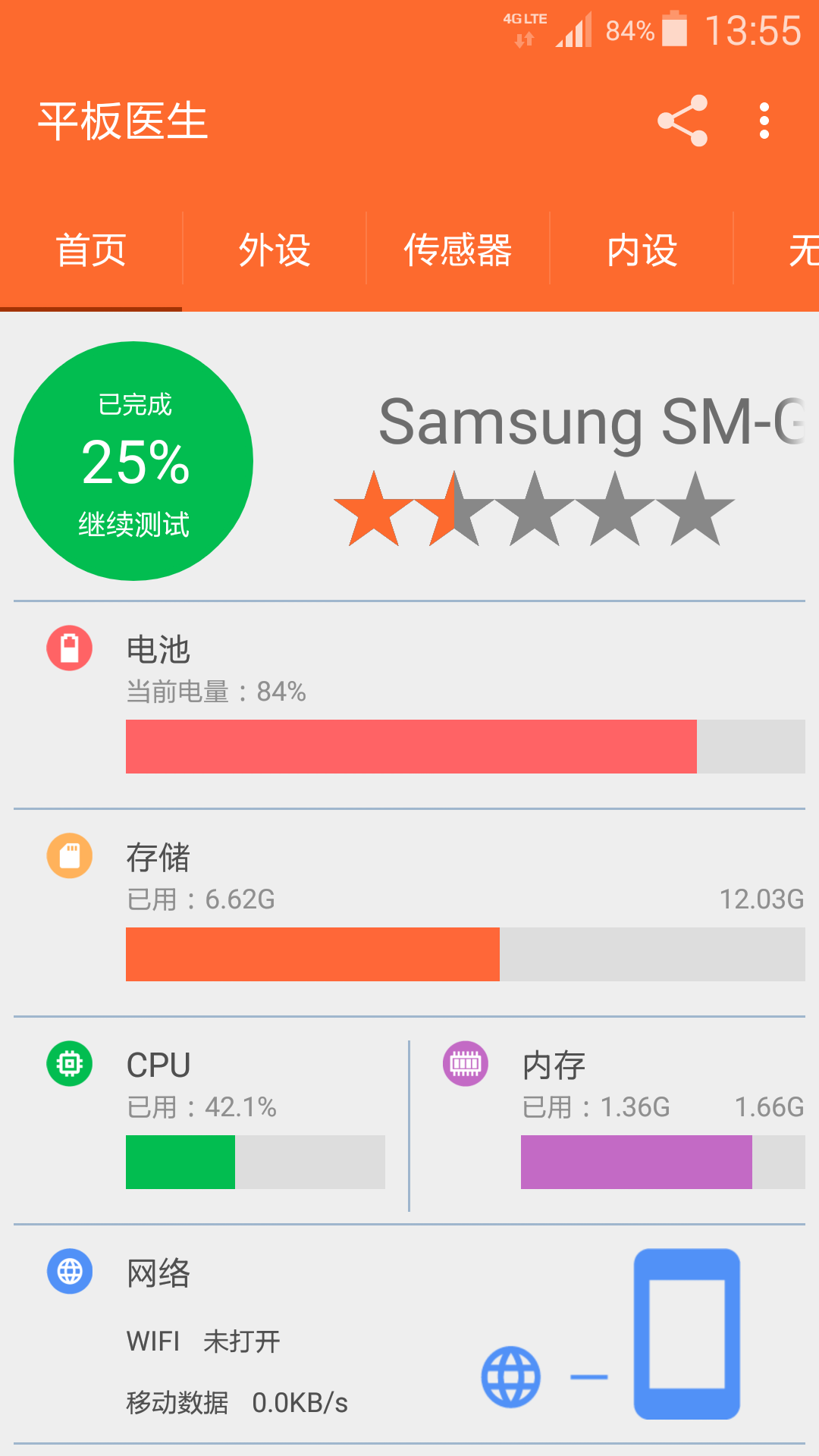 平板医生(Pad Doctor)是一款针对Android手机、平板的硬件进行一系列检测的软件。所涉及的信息全面,包含了外部设备、内部设备、传感器系统以及无线的各个测项。可以让你在购买和使用过程中及时全面了解到你的手机、平板是否存在问题。在测试过程中我们会用绿色的对号、红色的叉号以及灰色的惊叹号来分别表示你的硬件OK、异常以及你的设备不支持该测项。我们在首页除了直观的电池、存储、CPU以及网络等基本信息外还为你提供了检测进度提示,保证你可以对你的每一项硬件都进行了检测。清晰直观的星级评分,在你购买以及使用手机、平板的过程很有参考价值。所以对于不太了解硬件的朋友们,下载使用这款软件是非常必要的哦!
