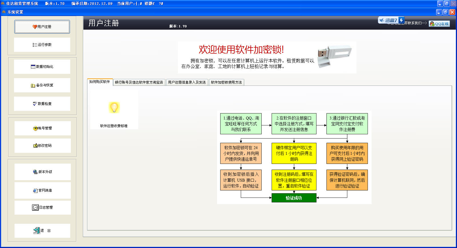 佳达租赁管理系统是一款小巧绿色的租赁管理系统软件。该软件拥有强大的租赁管理功能,可有效的帮助管理者管理自己的业务,提高工作效率,加快工作速度。