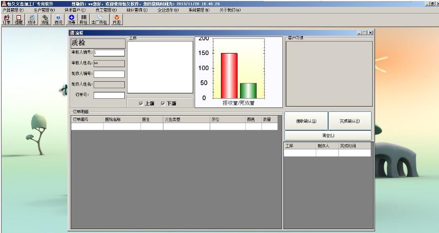 恒久义齿加工厂管理软件集成了义齿订单管理、订单搜索、返工登记、生产管理、任意组合查询、模糊查询、分类统计、报表打印、工作量计算、业务量合算、财务合算、系统维护等功能,是专门针对齿科加工制造业进行科学管理的软件系统。【软件功能】