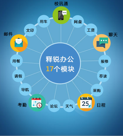 释锐校务办公软件是新一代高效学校事务助理软件,由释锐软件公司全新推出,小编把它推荐给该软件从“一个平台、多个模块”的设计理念出发,致力于成为学校教育信息化的核心工作平台。平台内置“站内信、校内聊、校讯通、网络U盘、日程、工资、报修、考勤、一卡通、请假、文印、用车、用餐、采购、荐读、论坛、天气、网址导航”等18个无纸化办公模块,解决了校内信息的流转问题,不管是教师还是学生,每个用户都可以在全校用户范围内采用一对一、一对多的方式给任何人、任何部门发送信息,收件人可以实时回复,发件人可以查阅实名签读。