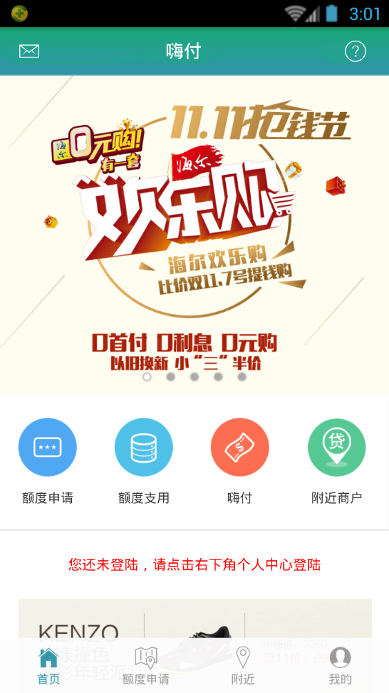 移动互联网是当今社会发展大势之一,如何满足5亿多智能手机用户的金融需求,海尔消费金融做出不懈努力。一款“嗨付”APP不仅轻松将用户接入移动金融世界,享受海尔消费金融丰富便捷的产品和服务,也再次刷新了用户分期消费体验,促进家庭消费方式2.0时代的到来,进一步完善了家庭消费金融生态圈。“嗨付”APP。欢迎页面简洁明了,功能分类清晰易上手。在进行简单的手机号验证后便可轻松完成注册。按照界面要求提交身份资料,绑定银联通过验证之后,就能进行额度申请,申请到额度之后既可以持额度申请“嗨客贷”,也可以在“嗨商城”中进行分期购物。商城中的所有商品均支持分期,并设有“0息专场”。