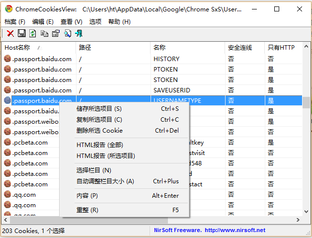 ChromeCookiesView是一款非常实用的谷歌Cookies查看工具,这款软件可以显示由谷歌Chrome浏览器的Web浏览器保存的所有Cookie的列表,方便用户清除一些不需要的cookies,同时它也可以帮助用户导出到文本/ CSV / HTML / XML等文件,让用户彻底掌控浏览器。