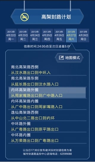 可以查看近一周内的高架道路封路情况,以便及时调整出行方案,合理安排行车路线。
