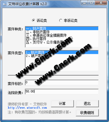 艾特诉讼收费计算器标 完全免费,免安装直接运行;附带《诉讼费用交纳办法》全文。